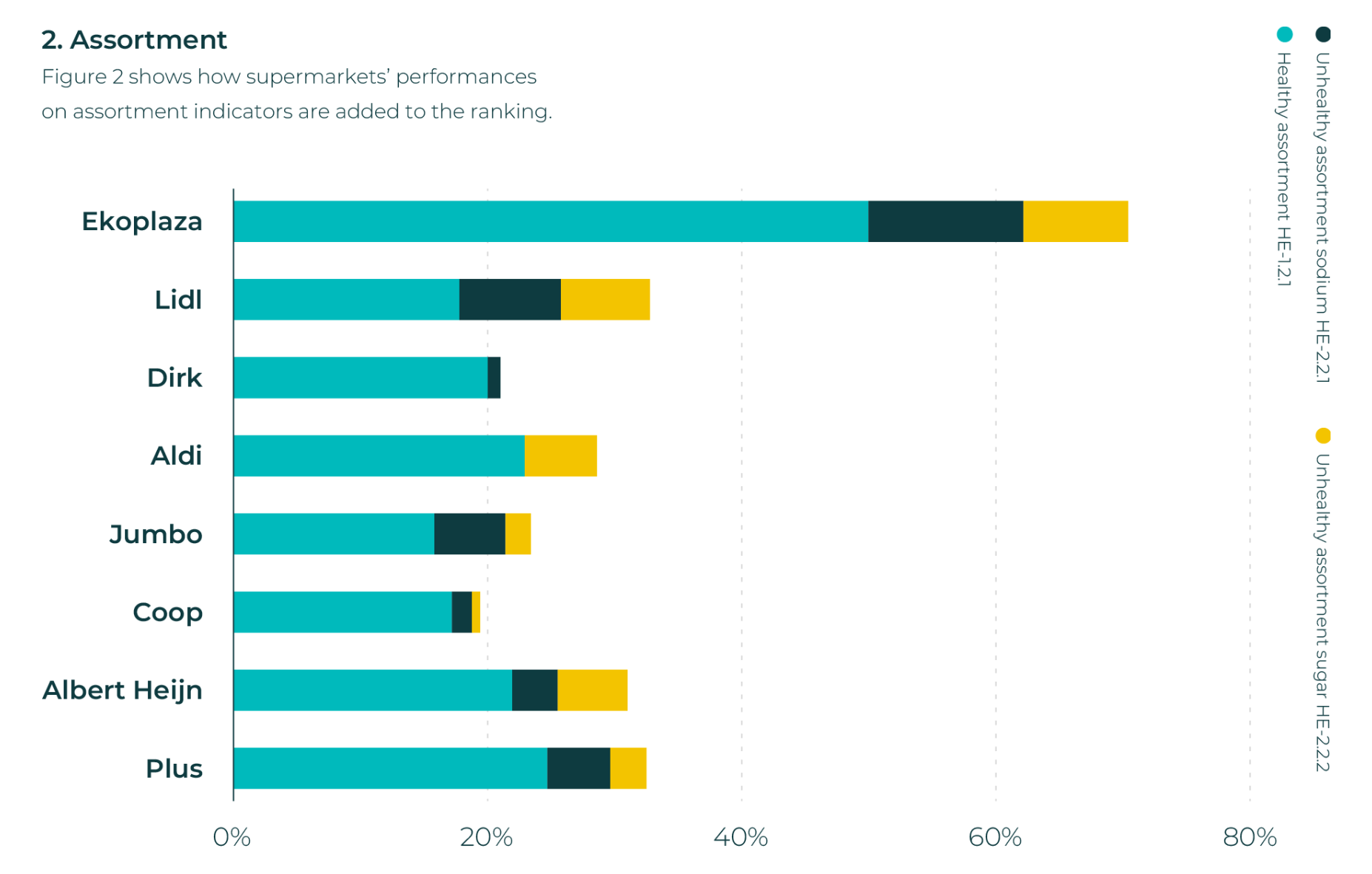 The goals set in the National Product Improvement Approach for salt and sugar reduction in 2030 are far out of reach for all supermarkets, for the researched product groups. Although almost all supermarkets show a reduction in the most salty products in the categories meat, meat substitutes and sauces. Albert Heijn and Ekoplaza come closest to reaching the goals to reduce sugar in soft drinks.