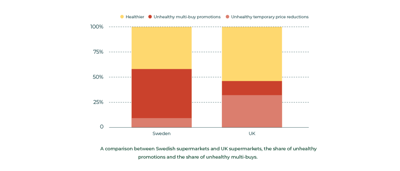 Swedish supermarkets made more use of multi-buy promotions for unhealthy products (82 percent) than UK supermarkets (28 percent).
