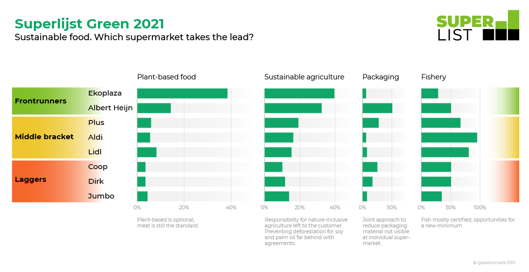 Based on the research results and the weighting, a ranking of the supermarkets was prepared. The ranking shows which supermarkets belong to the frontrunners, the laggards and which are average according to how well they help their customers to make a choice that is good for the environment and nature.