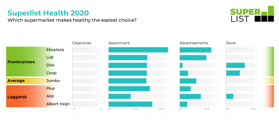 “Superlist Health” is the first ranking that compares what eight Dutch supermarkets are doing to support their customers in choosing healthy food and drinks. Ekoplaza, Lidl, Dirk and Coop are the front-runners; Jumbo, Plus, Aldi and Albert Heijn are running behind. The report shows that there are large differences between the supermarket chains, regardless of their formula or market share.