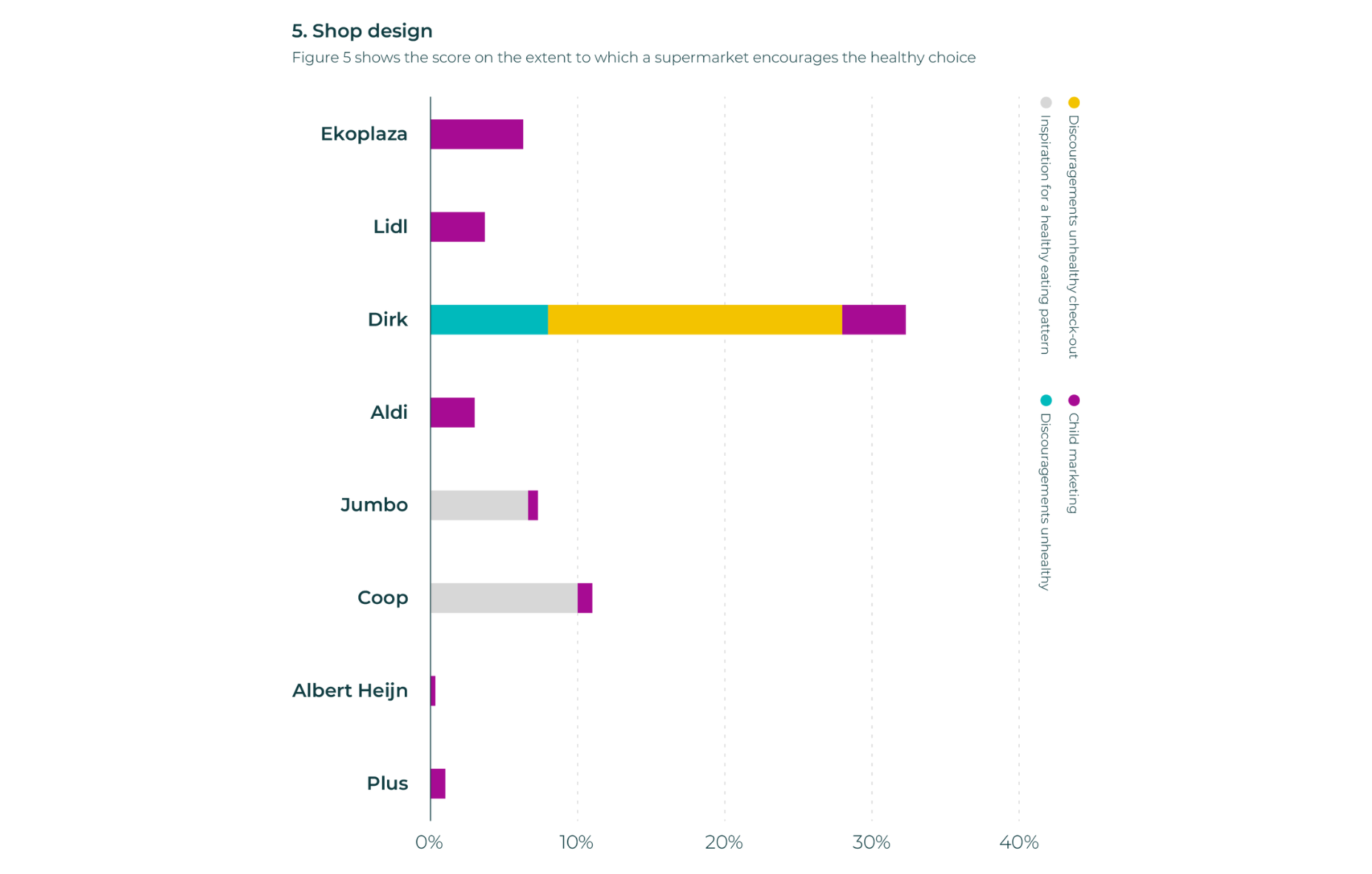All supermarkets - except for Dirk - still tempt their customers to unhealthy choices at the check-out. Often these unhealthy products target children specifically. Moreover, all supermarkets still market unhealthy products to children in multiple unhealthy product groups, such as breakfast cereals, soft drinks, desserts, and candy.