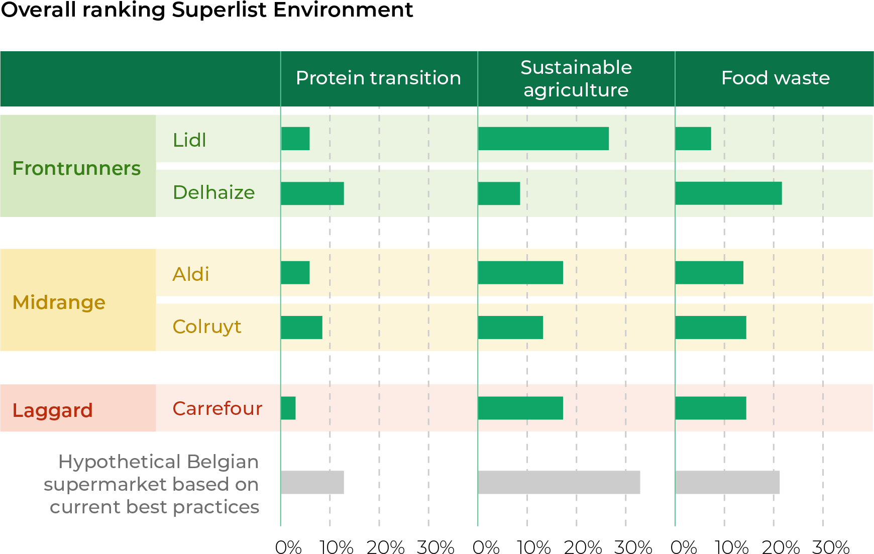 Supermarkets can dramatically increase their efforts in making the food system sustainable. Although there are promising practices across all supermarkets, supermarkets in Belgium currently do not considerably contribute to a more plant-based diet, sustainable food, and less food waste. These are the main findings of Superlist Environment Belgium 2022, obtained by evaluating policy, assortment, promotions and in-store tactics. By entering into dialogue with each other (civil society actors and policy makers) supermarkets can greatly increase their impact on transitioning towards a sustainable food system.