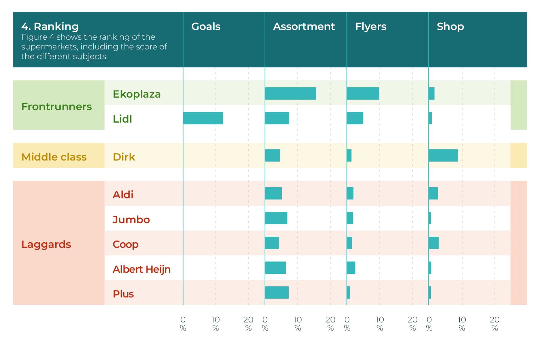 Using these findings, a ranking of supermarkets was prepared based on a weighting set in advance. The ranking shows which supermarkets generally belong to the frontrunners, laggards or the average group. The ranking has changed slightly. Similar to 2020, Ekoplaza and Lidl are frontrunners in the market. They have increased their distance to other supermarkets, including former frontrunners Dirk and Coop.