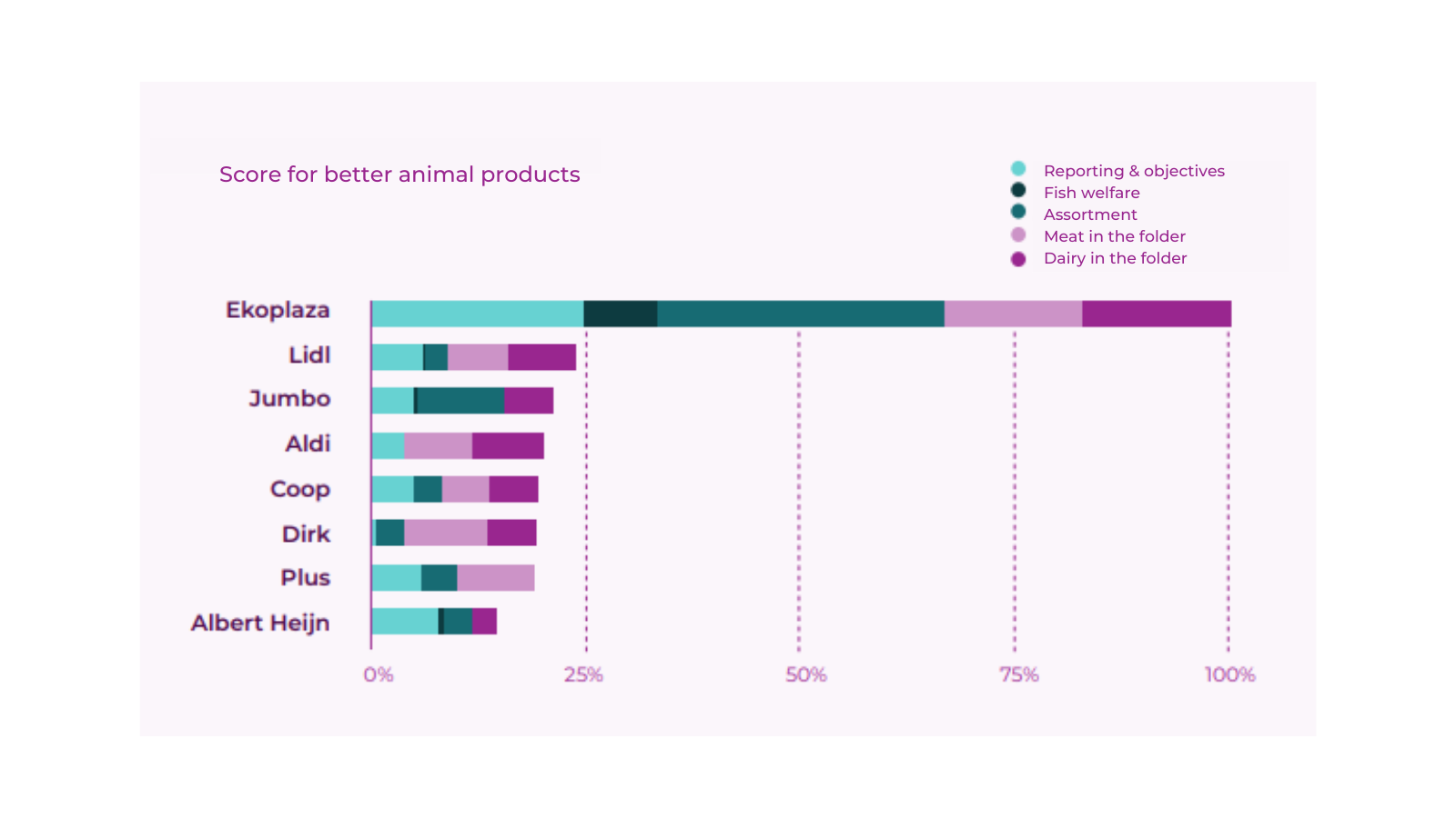 Supermarkets do not yet take full responsibility for the welfare of animals behind the products they offer. The actual measures taken by supermarkets are difficult to compare; policy and reporting are often incomplete or not formulated in comparable terms and not all commitments from the past have been met