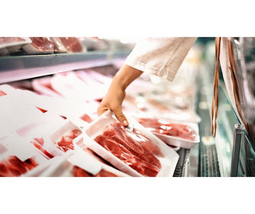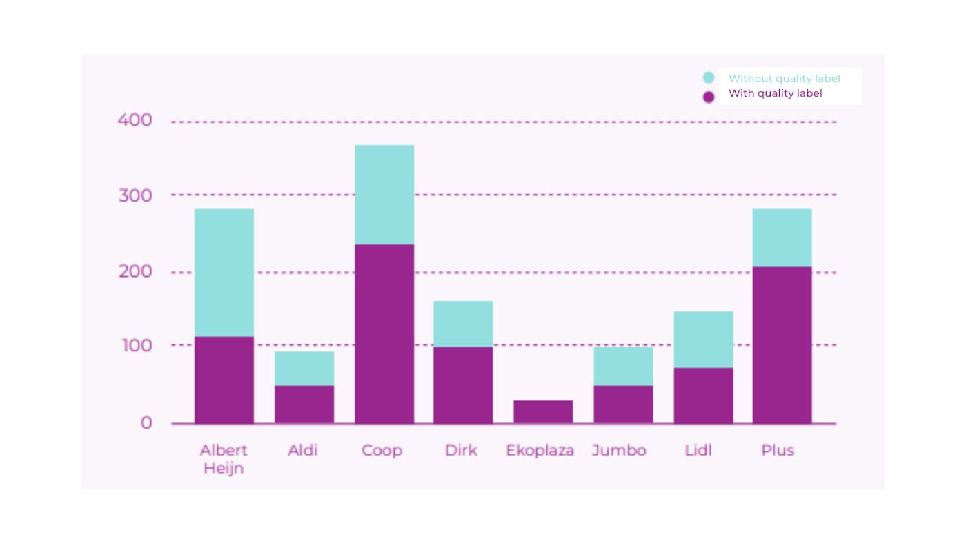Meat with (purple) and meat without (blue) relevant quality mark for animal welfare on sale per supermarket.
