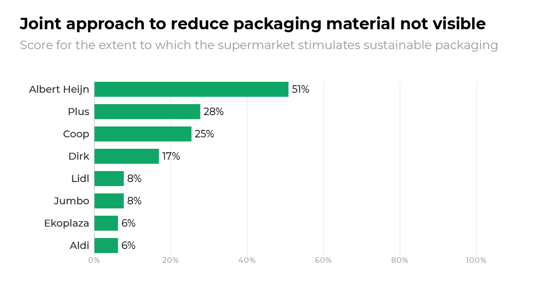 Supermarkets score mainly on formulating the goals as formulated in the overall industry plan and the Plastic Pact but are lagging behind in the reporting. The reduction of packaging material is (far) behind the commitments Dutch supermarkets have made.