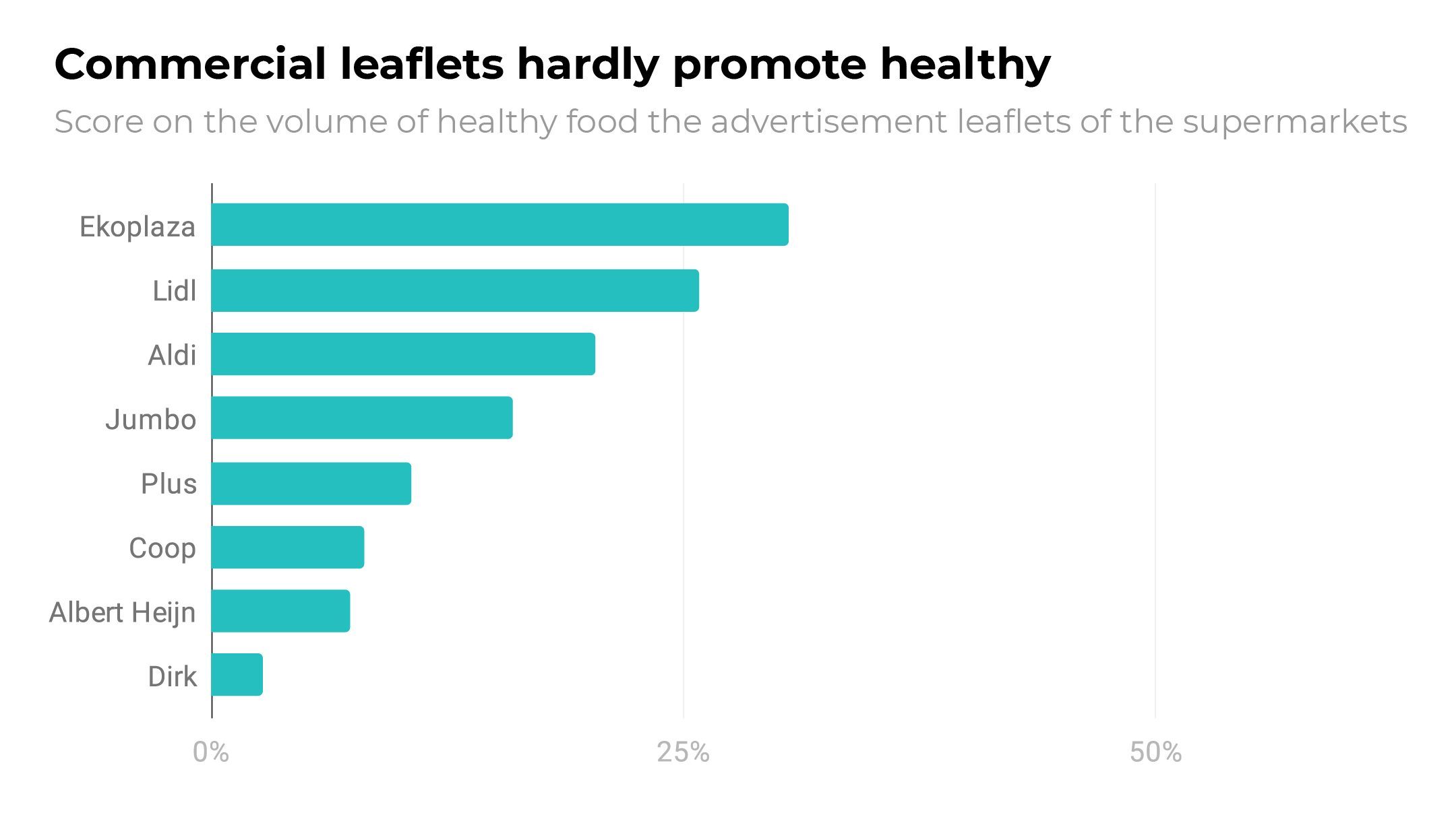 The folder with special offers can be a powerful means to help people eat a more healthy diet. In practice, unhealthy products predominate in all advertising folders. On average, 82% of the specials advertised in folders are unhealthy. In this survey just one folder contained more than 40% of products from the basic 5 food groups, and it was from Lidl. Sub-categories show greater differences. While advertising for sugar-filled drinks for children and alcohol is still the norm in many supermarkets, Ekoplaza occasionally issues 'alcohol-free' folders and Lidl does not have special offers of sugar-filled drinks in the small cartons that are typically given to children.