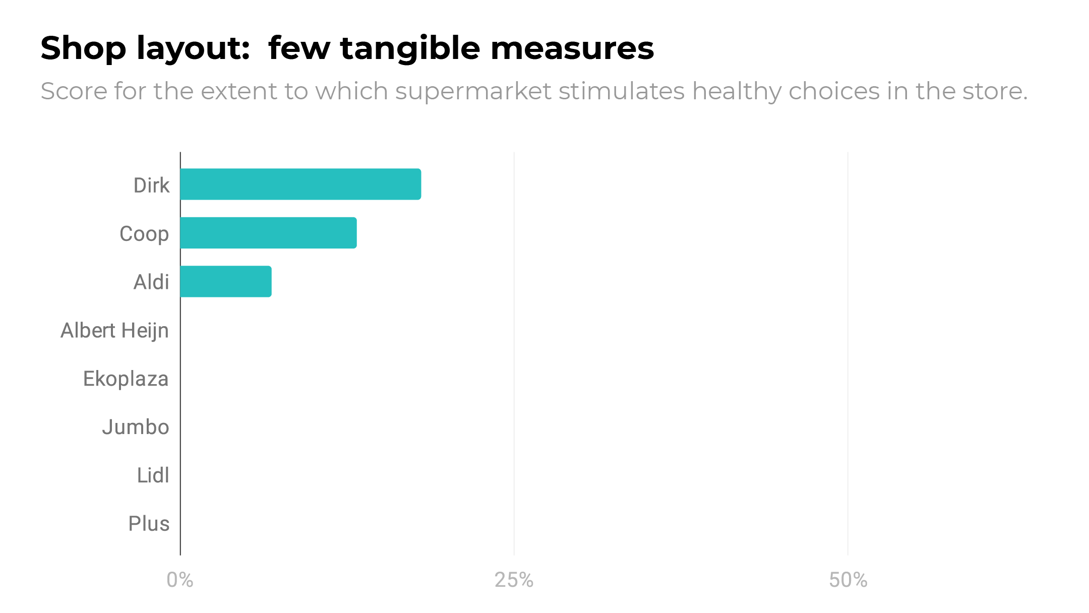We did note that several supermarkets have nutrient guides on their shelves: coloured signs that indicate which products are relatively unhealthy in terms of their nutritional value. Dirk is however the only supermarket where this measure is implemented consistently. The figure below displays the differences in scores for shop layout.