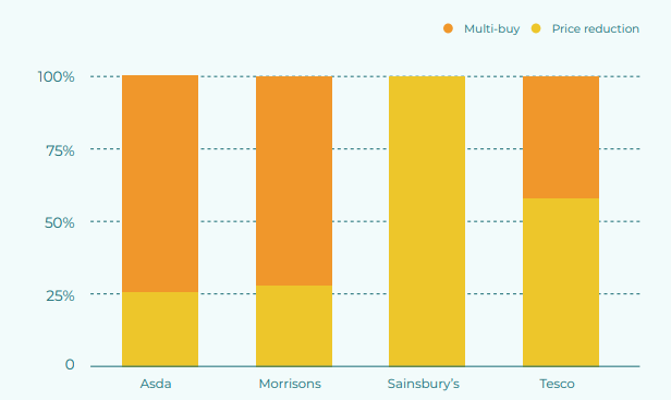 Figure below reveals that Asda and Morrisons run more multi-buy promotions for animal products than price reduction promotions. Almost three in every four of their meat promotions only holds for customers purchasing multiple items. Secondly, Sainsbury’s policy since 2016 to stop using multi-buy promotions continues (Sainsbury’s, 2016). This suggests that the use of meat multi-buys is not essential for running an economically viable business.