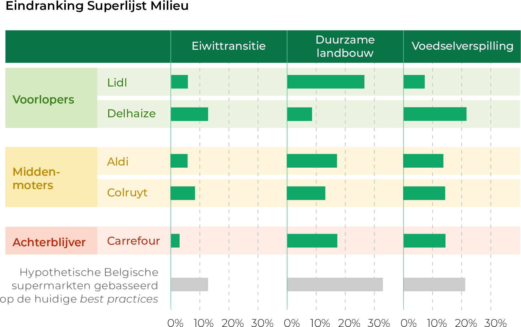 Opmerkelijk is dat de supermarkten sterk verschillen binnen de deelonderwerpen: eiwittransitie, duurzame landbouw (incl. ontbossing) en voedselverspilling. In de transitie naar minder vlees en meer plantaardig doet Delhaize het beduidend beter dan Lidl, Aldi en Carrefour. Ook bij beleid tegen voedselverspilling staat Delhaize al een stapje verder. Bij acties voor duurzame landbouw en tegen ontbossing loopt Delhaize dan weer achter, terwijl Carrefour, Aldi en vooral Lidl vooroplopen in België. Colruyt zit voor elk onderwerp in de middenmoot. Maar in absolute termen heeft elke supermarkt nog erg veel ruimte voor verbetering.