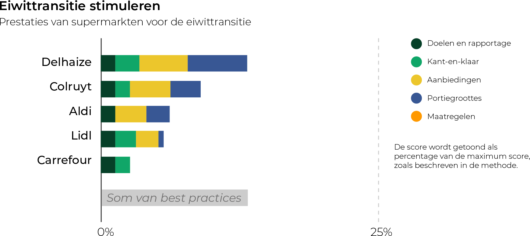 Supermarkten stimuleren mensen nog te weinig om vaker plantaardig te eten. Alle supermarkten geven aan bewust te zijn van het belang van de eiwittransitie (de overgang naar een voedingspatroon met meer plantaardige eiwitten), maar hebben geen concrete doelstellingen om de verkoop van plantaardige eiwitten ten koste van dierlijke eiwitten te vergroten.