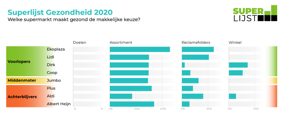 Een supermarkt kan zijn klanten niet gezonder maken. Wel kunnen supermarkten gezond voedsel de makkelijkste keuze te maken. Met Superlijst Gezondheid laten we zien welke supermarkten daarbij voorop lopen, en welke nog achterblijven. De supermarkten die wij onderzoeken zijn: Albert Heijn, Jumbo, Lidl, Aldi, Plus, Dirk, Coop en Ekoplaza.