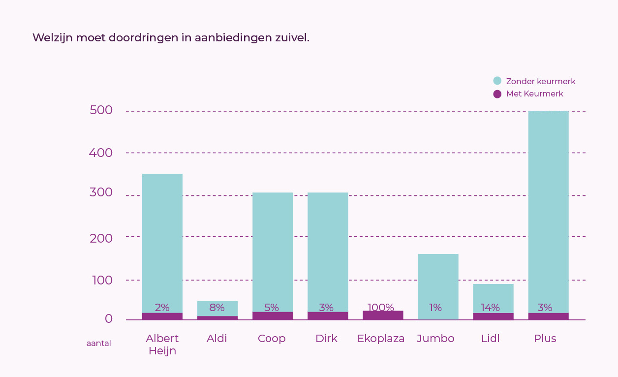 De hoeveelheid zuivel en eieren in de aanbiedingenfolders verschillen sterk per supermarkt. Behalve Ekoplaza, zetten alle supermarkten het stimuleren van diervriendelijkere zuivel en eieren met aanbiedingen niet hoog op de agenda, door slechts een klein aandeel variërend van <1% (Jumbo) tot <15% (Lidl) met relevante dierenwelzijnseisen in de folder aan te bieden.