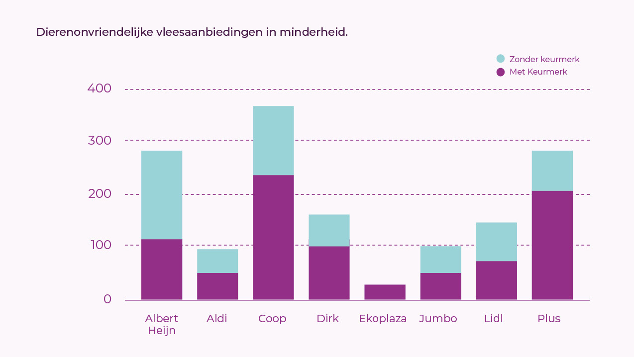 De hoeveelheid vlees in de aanbiedingenfolders verschilt sterk per supermarkt. Coop heeft het meeste vlees in de aanbieding, gevolgd door Albert Heijn en Plus. Ook de hoeveelheid aanbiedingen voor vlees met relevant dierenwelzijnskeurmerk verschilt sterk. Ekoplaza is de enige die enkel diervriendelijkere vlees in de aanbieding heeft. Plus volgt met 73%. Albert Heijn heeft het laagste percentage met 41%. De meerderheid van de vleesaanbiedingen heeft keurmerk dierenwelzijn.