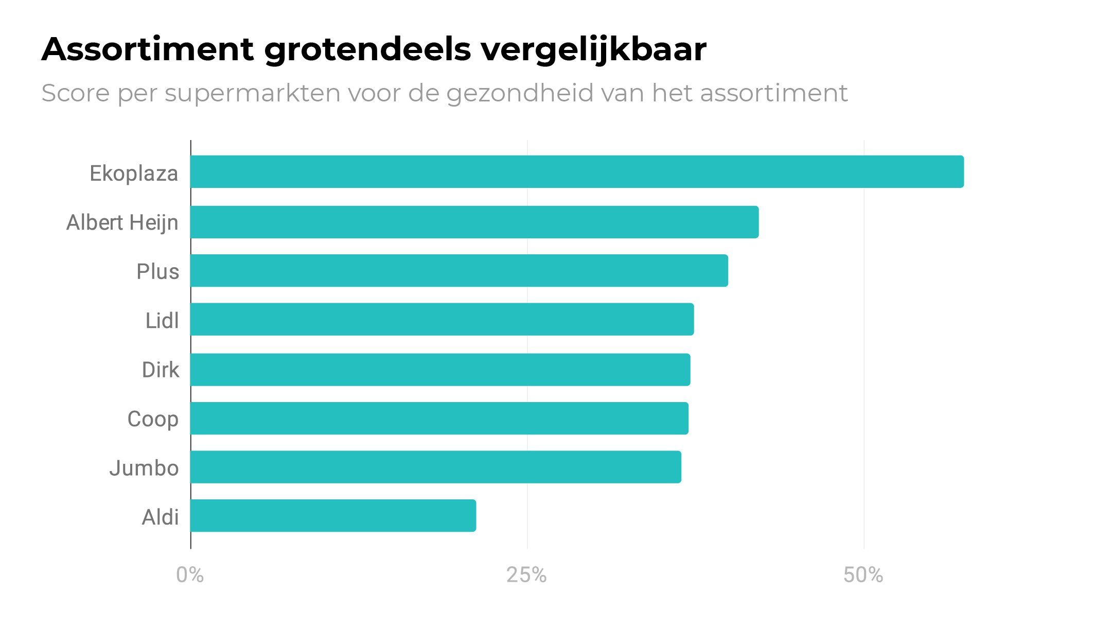 Het aandeel gezonde producten in de assortimenten van supermarkten ligt niet ver uit elkaar. Zelfs als productgroepen met 'verwenproducten' als snoep, chocola en chips buiten beschouwing blijven, valt gemiddeld 59 procent van het assortiment buiten de Schijf van Vijf.