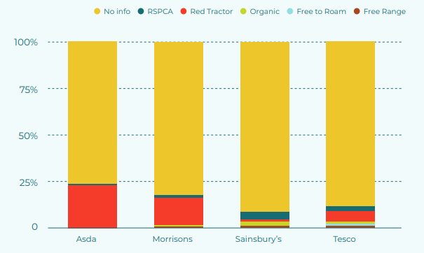 Supermarkten geven zelden informatie over productiemethoden. En niet alle supermarkten zijn transparant over de herkomst van hun vleesproducten. Bij Asda ontbreekt het bij 53% van de vleesproducten aan een etiket over de oorsprong. Om meetbare doelen te stellen om 'minder en beter' vlees en zuivel te verkopen, moeten supermarkten over details beschikken over de herkomst en productiemethode. Deze informatie kan ook klanten betrouwbare informatie verschaffen om beter geïnformeerde voedselkeuzes te maken.