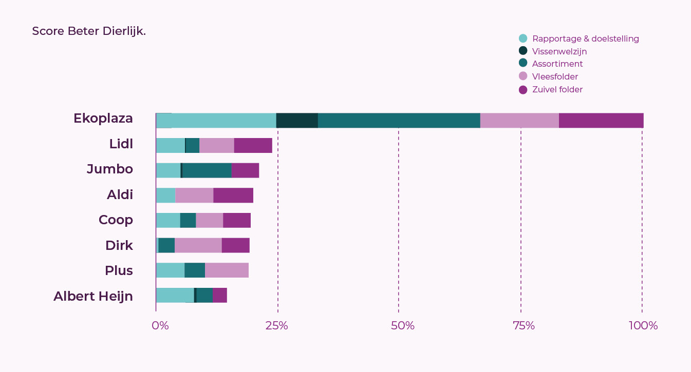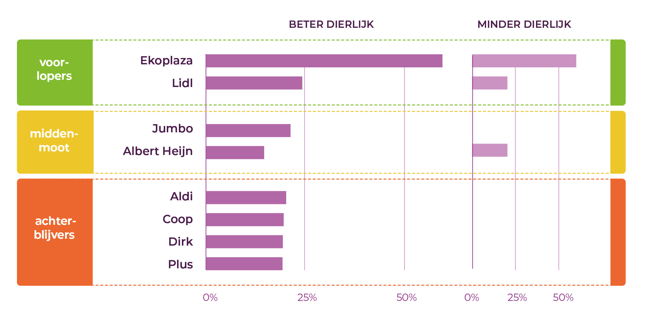 Supermarkten leggen de verantwoordelijkheid voor een diervriendelijkere veehouderij doorgaans bij hun klanten. Dierlijke producten zonder relevant welzijnskeurmerk zijn de standaard en soms zelfs de enige optie. In de reclamefolder heeft ongeveer de helft van het vlees inmiddels een relevant keurmerk, maar bij zuivel moet die ontwikkeling nog beginnen. Positief is dat een aantal supermarkten sinds kort rapporteert over dierenwelzijn in de verkoopcijfers.