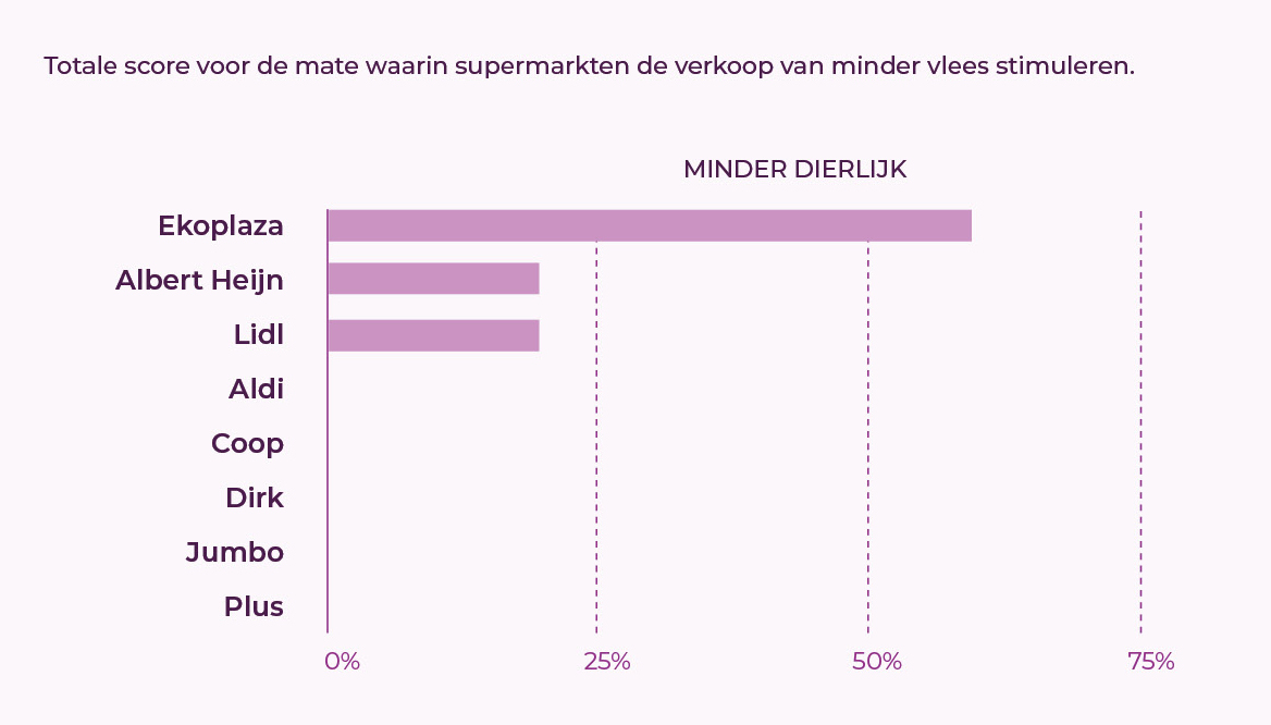 Geen van de onderzochte supermarkten, behalve Ekoplaza, stuurt op het verminderen van de verkoop van dierlijke producten. Rapportage en doelstellingen beperken zich meestal nog tot het stimuleren van vleesvervangers en andere alternatieven. Lidl en Albert Heijn geven globaal inzicht in het aandeel dierlijke producten in hun verkoop maar hebben nog geen doel opgesteld voor het verminderen van de verkoop van dierlijke producten.
